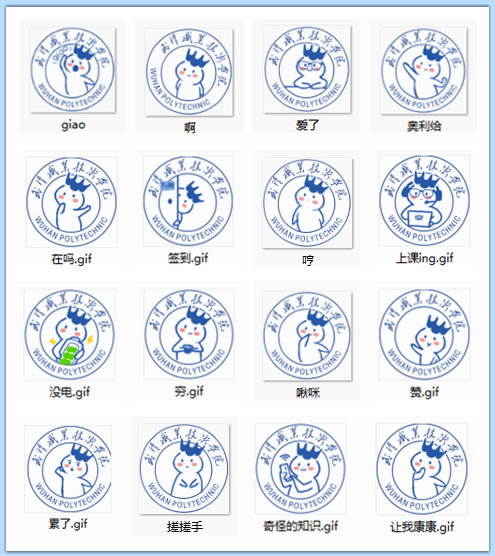 “武职飞飞”主图是简洁萌动的白色小人,王冠源自武职logo,象征着知识和技能,是陈璞老师带领往届会展专业员工原创的拟人化武职77779193永利品牌形象。第一组“武职飞飞”日常篇表情包自2018年10月上线以来,深受武职师生喜爱。