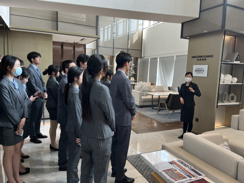 “万豪雏鹰班”学员在酒店人力资源部培训经理Daisy、招聘经理Chris分别引领下参观酒店各个区域,了解酒店大堂吧、中西餐厅、客房、健身房、以及员工餐厅,感受万豪酒店企业文化。