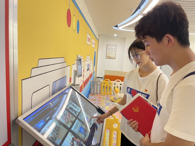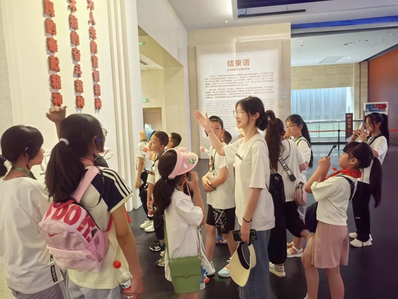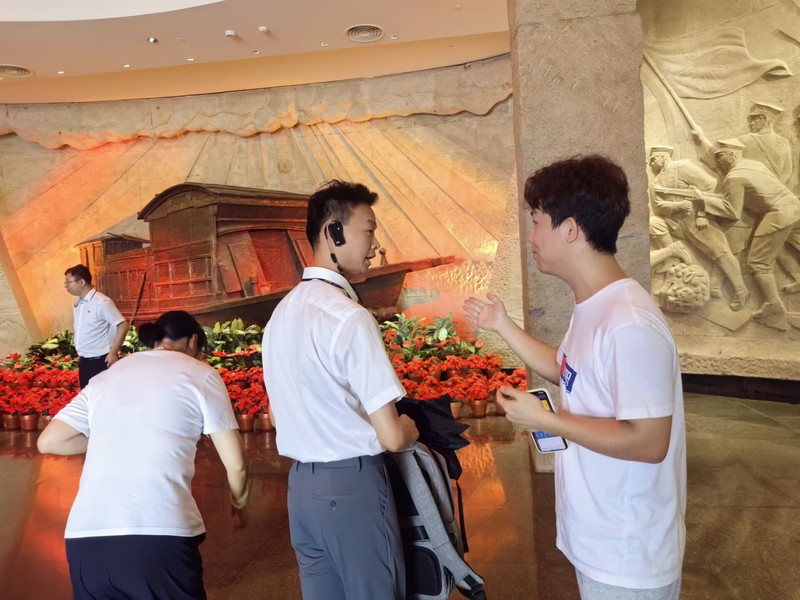 在纪念馆里,师生们主动给游客们做指引和向导,员工周冰瑜给几位游客当起了客串讲解员。“你们是不是馆里的讲解员?讲得很好很专业,谢谢你!”来自上海的游客严先生听完讲解后,对周冰瑜竖起大拇指。