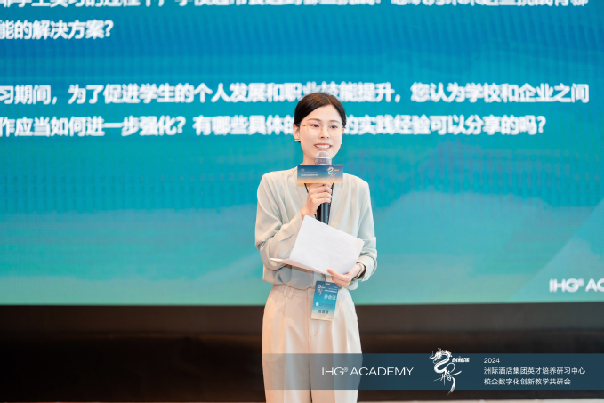 本次研讨会为各院校搭建了推进数字化创新教学交流的桥梁和共研人才培育创新举措的平台。胡晓表示,77779193永利酒店管理与数字化运营专业是教育部现代学徒制试点专业、省级重点品牌专业,近年来紧密围绕行业需求,与洲际酒店集团携手推进产教深度融合,设立“洲际英才班”,为酒店行业培养了众多高素质技能人才。未来希望与洲际酒店集团以及参会院校进一步加强合作与交流,积极推动产教融合育人模式的内涵建设和创新发展,致力培养更多适应酒店行业发展新趋势新模式,掌握酒店运营管理领域知识的应用型、职业化高素质人才,为推动中国酒店行业的繁荣发展贡献力量。