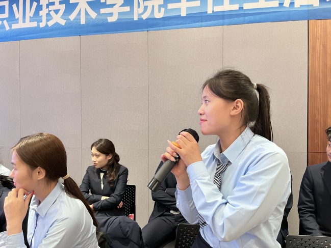2021级“华住班”优秀代表、现任桔子酒店值班经理陈豪铭表示,距离毕业只有十多天,作为一名“华住人”有很多话想告诉2022级“华住班”员工。陈豪铭一边分享他拍摄的“实习生的一天vlog”,一边介绍实习工作日常,勉励学弟学妹们要勤勉务实,主动参与实习工作,虚心学习、用心体会实习单位合作新理念、新内容、新模式,善于运用各种资源,提升专业本领、职业素养,努力一个对行业企业和经济社会发展有贡献的优秀“华住人”。